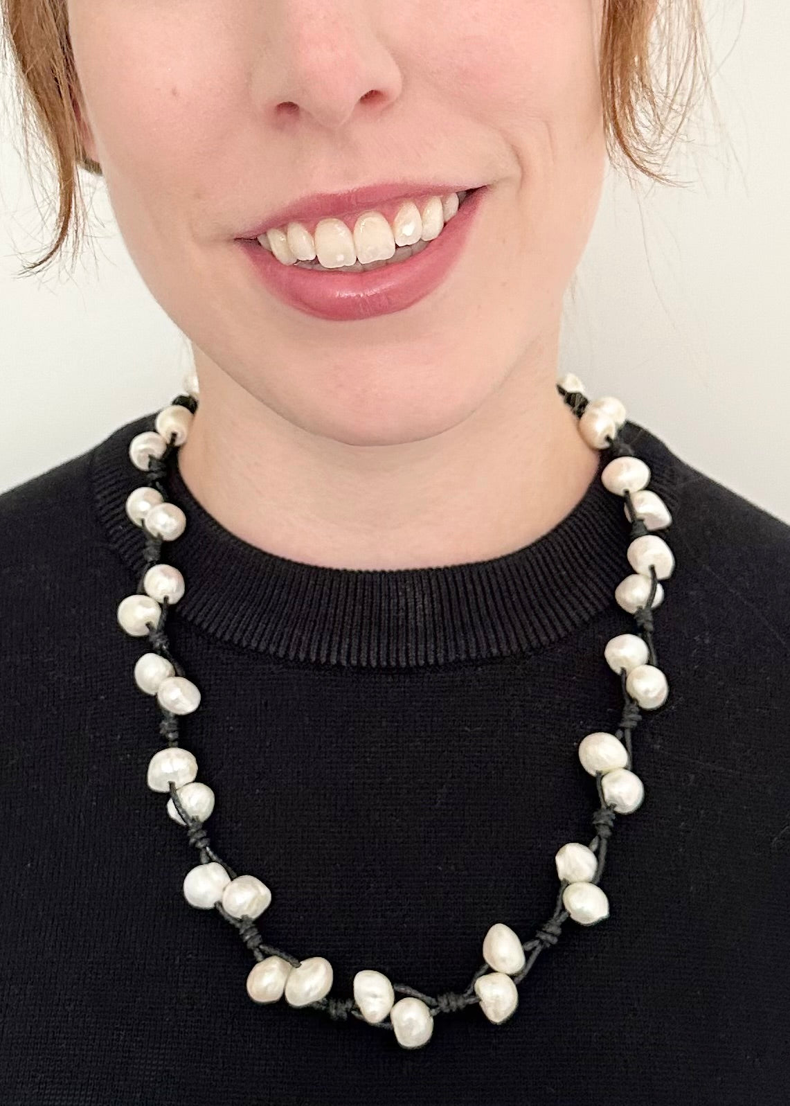 The casually elegant Eva necklace has large organic freshwater pearls knotted on cotton cord in a mid length with a large lobster claw clasp and a 2" extender chain. Perfect for everyday!