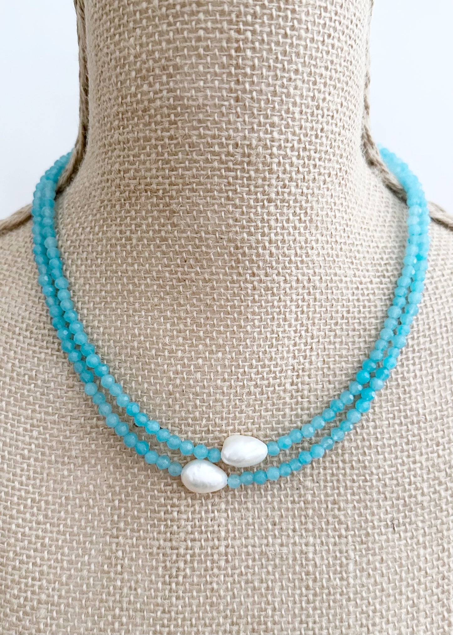 The Shan necklace has 2 strands of semi-precious stones with lustrous pearl accents. Casual and easy in a shorter length that sits nicely and perfect with denim.