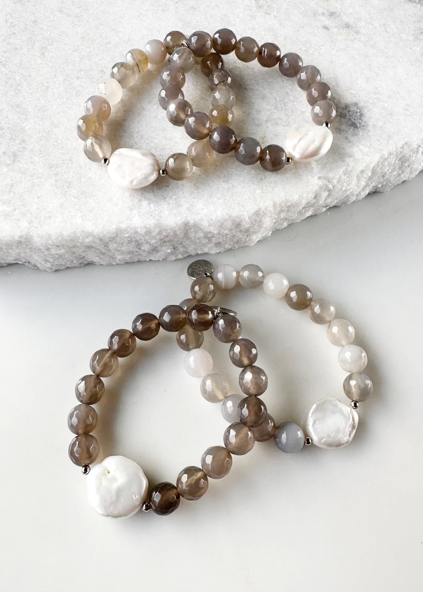 The Quincy stretch bracelet has 10mm faceted agate with a single coin pearl accented with metal beads. Pretty on it's own or added to your stack.