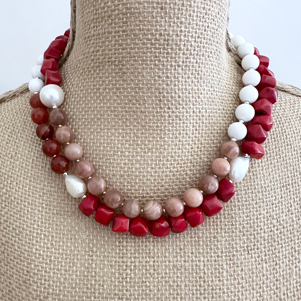 This beautiful one-of-a-kind necklace boasts a blend of colours, with vibrant red sea bamboo, peach moonstone, faceted carnelian, white agate and elegant white pearls accented with gold and silver beads. Wear this long or doubled.